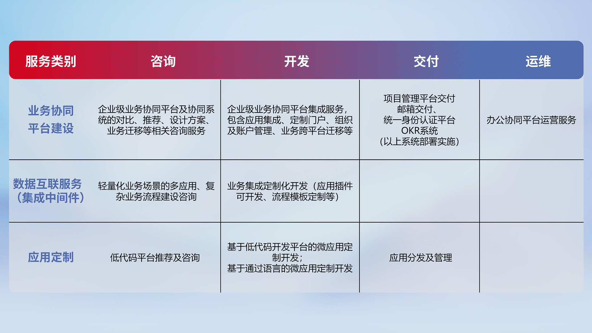 针对钉钉、、、、企微、、、IDaas等平台级产品提供产品的规划、、、、方案、、、交付、、、、定制化开发等服务,,,实现如统一协同办公、、智能客户服务、、混合会议管理、、、、智能数据查询、、、、等业务场景,,,实现数字化转型。。